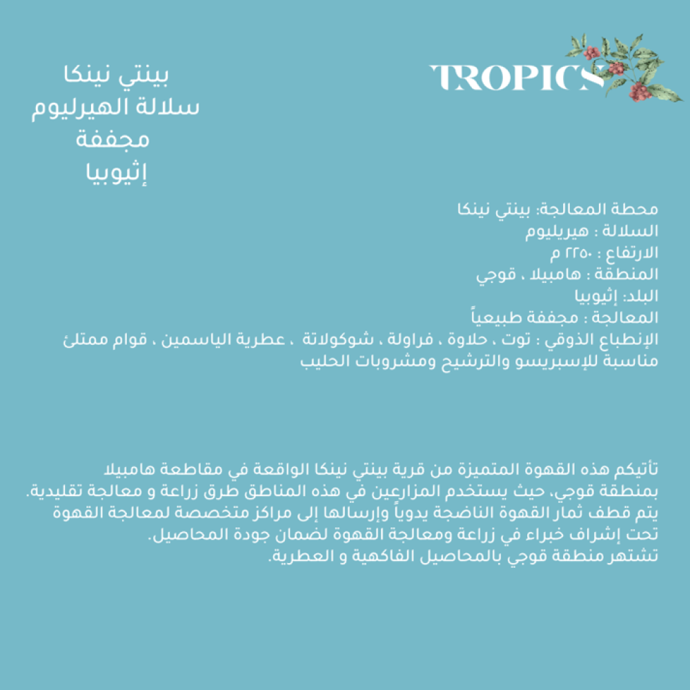 تأتيكم هذه القهوة المتميزة من قرية بينتي نينكا الواقعة في مقاطعة هامبيلا بمنطقة قوجي، حيث يستخدم المزارعين في هذه المناطق طرق زراعة و معالجة تقليدية. يتم قطف ثمار القهوة الناضجة يدوياً وإرسالها إلى مراكز متخصصة لمعالجة القهوة تحت إشراف خبراء في زراعة ومعالجة القهوة لضمان جودة المحاصيل. تشتهر منطقة قوجي بالمحاصيل الفاكهية و العطرية.